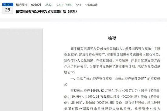 11月28日,精功科技(002006)、会稽山(601579)分别披露公告,根据法院裁定批准的《精功集团等九公司重整计划》(以下简称“重整计划”),中建信将斥资11.84亿元取得精功集团持有的精功科技1.37亿股股份(占公司总股本的29.99%)、支付18.73亿元取得精功集团持有的会稽山1.49亿股股份(占公司总股本的29.99%)。上述股份将全部转入中建信之全资子公司中建信浙江公司。本次权益变动后,中建信浙江公司拟将成为精功科技、会稽山两家上市公司的控股股东,方朝阳拟将成为实际控制人。