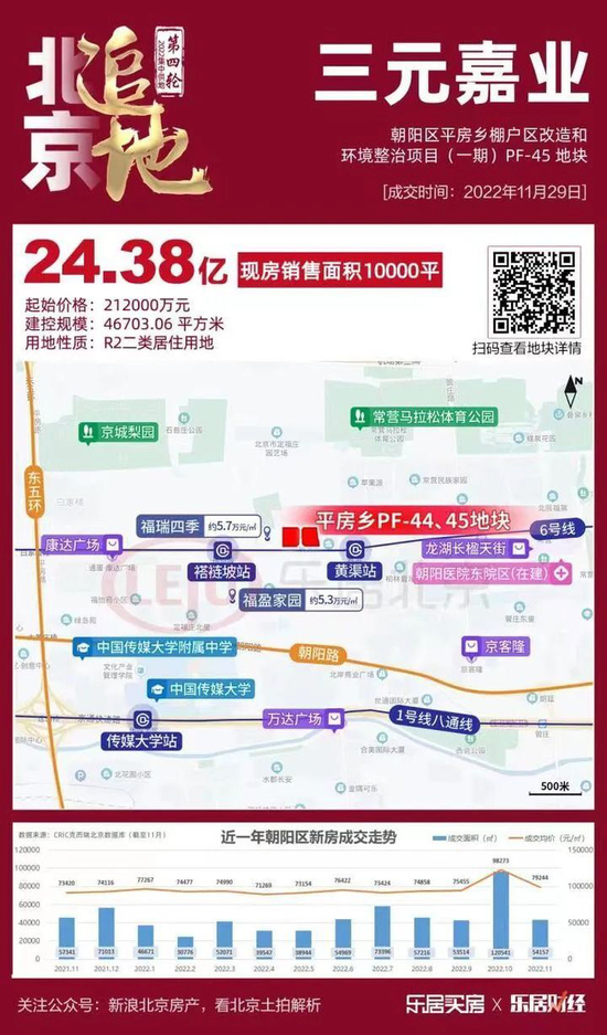 10分钟后,三元嘉业号码球被摇中!三元嘉业终于在朝阳拿到一宗商品住宅用地,成交价24.38亿元,现房销售面积1万㎡,楼面价5.22万元/㎡,溢价率15%。
