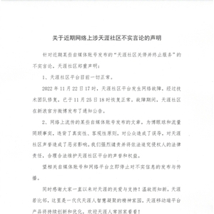 具体来看,天涯社区声明称,11月22日17时,天涯社区平台发生网络故障,经过技术团队修复,已于11月25日18时恢复正常。故障期间,天涯社区在新浪官方微博发布了通知公告。