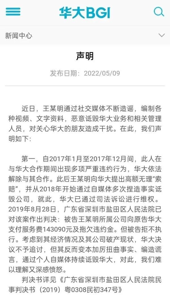 并做出五点声明:第一,自2017年1月至2017年12月间,此人在与华大合作期间出现多项严重违约行为,华大依法解除与其合作。此后王某明向华大提出高额无理“索赔”,并从2018年开始通过自媒体多次捏造事实诋毁公司,就此,华大已通过司法诉讼进行维权。2019年8月28日,广东省深圳市盐田区人民法院已对该案作出判决:被告王某明所属公司向原告华大支付服务费143090元及拖欠的违约金。但被告拒不执行。考虑到其经济情况及其公司破产现状,华大决议不予追讨,但其反而变本加厉扭曲事实、编造谎言,通过个人自媒体持续诋毁华大,对此,我们难以理解又深感愤怒。判决书详见《广东省深圳市盐田区人民法院民事判决书(2019)粤0308民初347号》。