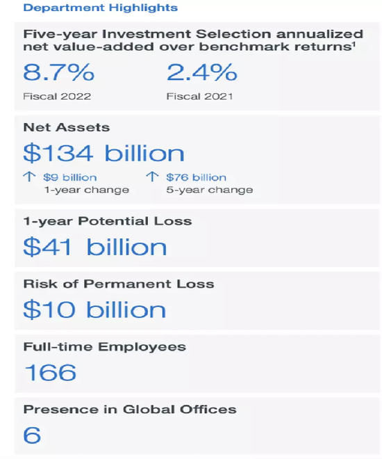 因此在追求长期回报最大化的同时,成本管理是CPPIB公共责任的核心原则。2022财年,CPPIB毛收入868.01亿加元,各种支出的成本28.57亿加元,净收入839.44亿加元,相较于5000多亿加元的管理规模,成本率仅为千分之5.46。