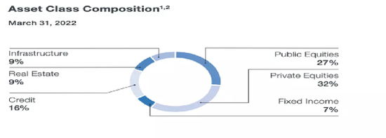 加拿大人正在这么干,前面提到的27%和32%,正是加拿大养老金投资委员会(以下简称“CPPIB”)在2022年年报中,公布的投资二级市场及一级市场的比例,这两项通常意义上的高风险投资,占到了整个养老金投资组合的将近60%。