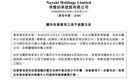 12月5日晚,奈雪的茶发布公告称,拟投资5.25亿元收购乐乐茶43.64%的股份。交易完成后,奈雪的茶将成为乐乐茶第一大股东,乐乐茶将成为奈雪的茶的联营公司,并将继续维持独立经营,即乐乐茶仍将保持品牌不变、团队不变、运营不变。