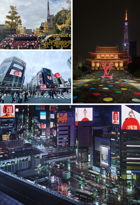 日本是这场宣传的主阵地,尤其是在东京。除了在商圈写字楼的广告大屏上循环播放草间弥生出镜的裸眼3D广告之外,Louis Vuitton还在涩谷、银座以及东京塔、增上寺等多个地标都装点上了草间弥生标志性的波点图案,配合上AR技术的加持,路人只需用手机镜头对准波点就从现实世界中进入到艺术家的虚拟波点空间中。这一切都使得整个东京城犹如艺术家的个人展厅。