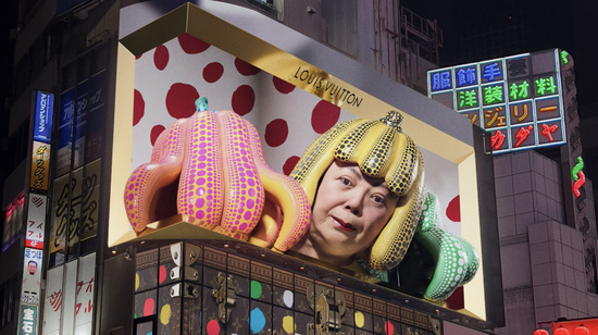 从11月底开始,前文所述的那一幕已经在日本京东、中国上海等多地发生,人们看到的是Louis Vuitton为其与日本艺术家草间弥生新联名合作系列发布进行的先导宣传。在2012年首次联合草间弥生推出合作系列之后,Louis Vuitton在2022年底兑现了与艺术家之间的十年之约,再次推出合作系列,并为此制造了一场声势浩大的宣传。