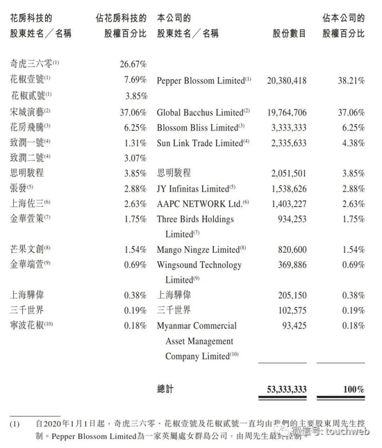 IPO前,360董事长周鸿祎控制花房集团约38.21%股权,宋城演艺通过Global Bacchus Limited持股为37.06%,花房飞腾通过Blossom Bliss Limited持股为6.25%;