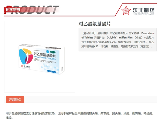 东北制药生产的退烧药,是对乙酰氨基酚片,也就是我们常说的扑热息痛片。在国务院联防联控机制日前发布的《新冠病毒感染者居家治疗常用药参考表》中,对乙酰氨基酚片被列入其中,适用于普通感冒或流行性感冒引起的发热,也用于缓解轻至中度疼痛,如头痛、关节痛等。