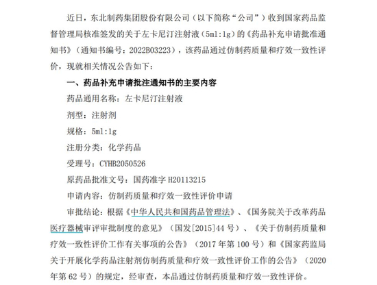 今年8月5日晚间,东北制药还公告称,其生产的左卡尼汀注射液通过仿制药一致性评价。据介绍,左卡尼汀注射液适用于慢性肾衰长期血透病人因继发性肉碱缺乏产生的一系列并发症状,临床表现如心肌病、骨骼肌病、心律失常、高脂血症,以及低血压和透析中肌痉挛等。