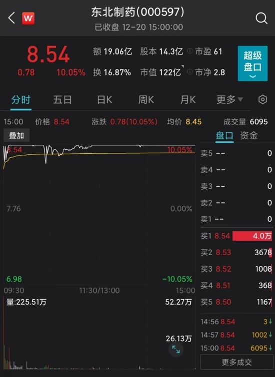 12月20日,东北制药高开后迅速封死涨停,盘中虽有开板,但随后回封 ,录得两连板。截至收盘,东北制药报价8.54元续创历史新高,成交额19.06亿元,总市值122.5亿元。