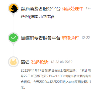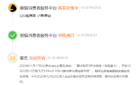 12月22日上午,消费者王强(化名)在黑猫投诉平台反馈表示,自己11月17日在i茅台app上看见一个活动——“累计购买3杯冰淇淋(含品鉴卡),开启12月22日10万瓶飞天53%vol 100ml贵州茅台酒抢购专场”,也致电客服核实确实符合资格。但当12月22日王强进入app页面参加抢购专场活动时,却发现并没有获得资格,期间也没有任何提示。对此,王强感到十分愤怒,感觉被耍了一样。