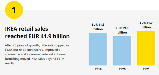 2020年9月1日至2021年8月31日止12个月,宜家总销售额达到创纪录的419亿欧元。而宜家全球餐饮收入占到总营收的8%