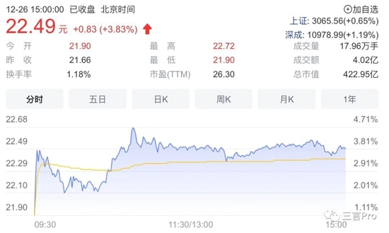 截止今日收盘,乐普医疗股价报22.49元,上涨3.83%,总市值422.95亿元;