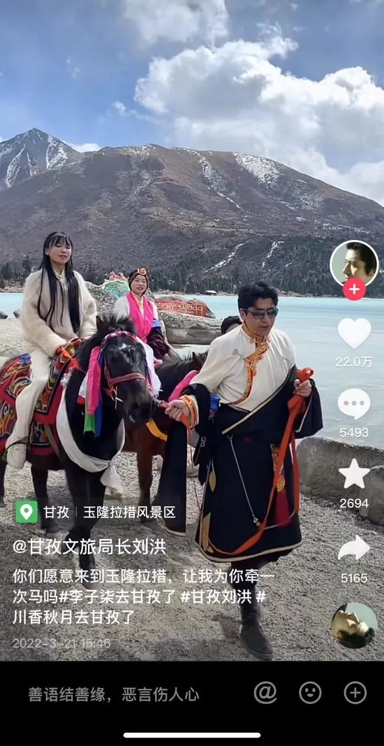 和她一起出席活动的还有甘孜的网红文旅局长刘洪,这个曾经捧红过丁真的文旅局长对于李子柒的到来很兴奋,不仅一连发布了两条抖音视频,更是为李子柒牵起了马——在甘孜民俗里,一个男人给一个女人牵马,表达了对她最高的尊重。