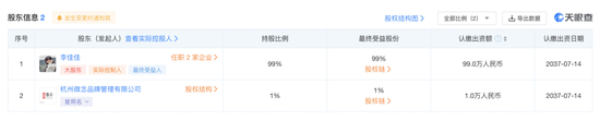 天眼查显示,12月26日,李子柒所在的四川子柒文化传播有限公司(下称“子柒文化”)发生过两项工商变更。一是微念董事长刘同明卸任监事一职,二是微念的持股比例由51%减至1%。与之相对应的,是李子柒夺回控制权,持股比例由原来的49%增至99%,成为子柒文化的疑似实际控制人。
