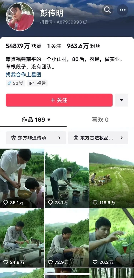 以传统物件的制造方式为主线,同样走节奏舒缓,风格治愈的“精致乡村风”的“彭传明”的涨粉速度还要更快,3个月内涨粉392万,涨幅超200%。由于其视频风格和主题与李子柒比较相似,网友也常常将彭传明与李子柒放在一起比较,一度传出“女有李子柒,男有彭传明”的说法。