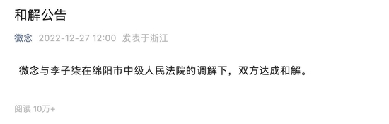 12月27日,微念在微信公众号与微博发布通知称,公司与李子柒在绵阳市中级人民法院的调解下,双方达成和解。
