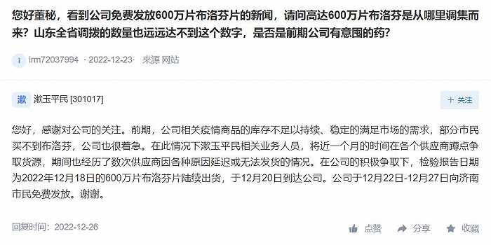 然而,这一举动并未得到大家的赞赏,反而引来投资者的质疑:“高达600万片布洛芬是从哪里调集而来,是否是前期公司有意囤药”。