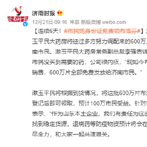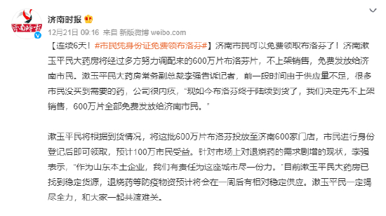 12月21日,据济南时报,漱玉平民大药房将经过多方努力调配来的600万片布洛芬片,不上架销售,免费发放给济南市民。