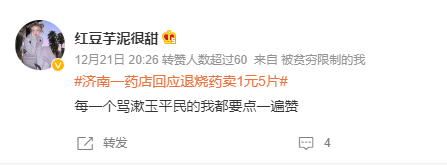 甚至有网友表示,“别把群众当脑残,疫情最厉害的时候,药价翻倍的涨,即便有药也不外放,导致药价无休止的膨胀,现在觉得这个钱烫手了,又开始拿着群众的钱维护自己的名声,还美其名曰是公益,真的很恶心!”