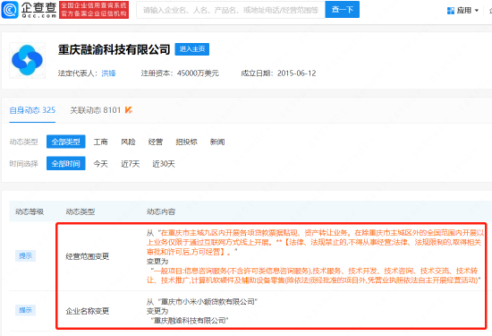企查查APP显示,12月29日,重庆市小米小额贷款有限公司发生工商变更,企业名称变更为“重庆融渝科技有限公司”;此外,公司经营范围从“在重庆市主城九区内开展各项贷款票据贴现、资产转让业务。在除重庆市主城区外的全国范围内开展以上业务仅限于通过互联网方式线上开展。”变更为“信息咨询服务,技术服务、技术开发等”。