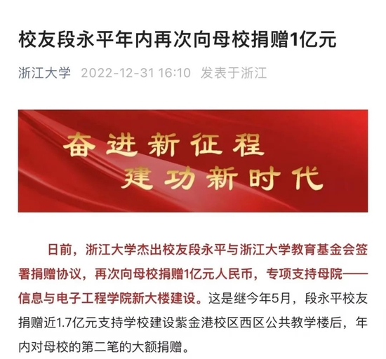 2022年的最后一天,浙江大学官宣了一笔重磅捐赠——浙江大学杰出校友段永平与浙江大学教育基金会签署捐赠协议,再次向母校捐赠1亿元人民币,专项支持母院——信息与电子工程学院新大楼建设。这是段永平2022年内对母校的第二笔大额捐赠,共2.7亿元。