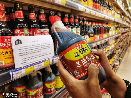 食品添加剂“双标”风波持续发酵,超市里的调味品专柜上张贴着海天味业的声明