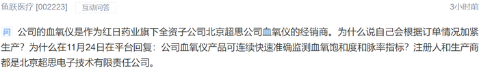 有投资者于1月4日在互动易平台发问称,鱼跃医疗的血氧仪并非全部由企业自行生产,有一部分经销的就是红日药业(300026)全资子公司北京超思电子技术有限责任公司生产的血氧仪,鱼跃医疗作为经销商,为什么说自己会根据订单情况加紧生产?