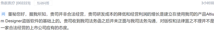 1月4日上午,鱼跃医疗互动易平台上出现一条最新留言称,鱼跃医疗研发成本的降低和经营利润的增长是建立在使用其他公司的产品Altium Designer盗版软件的基础上。在原软件研发公司给鱼跃医疗发去法务函后也没有得到沟通,留言称“对版权和法律置之不理并不是一家合法经营的上市公司应有的态度。”