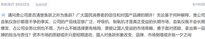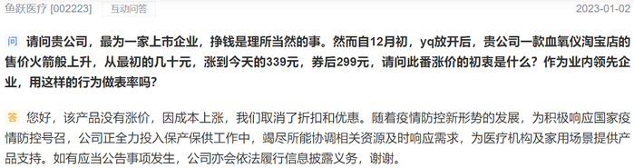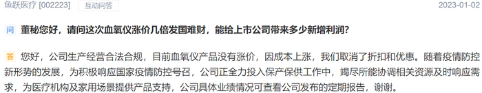 鱼跃医疗关于血氧仪涨价的各种解释并没有说服外界,有投资者留言称血氧仪占公司业务比例不高,呼吸机、制氧机是长期市场,公司为什么不拿出担当与责任?