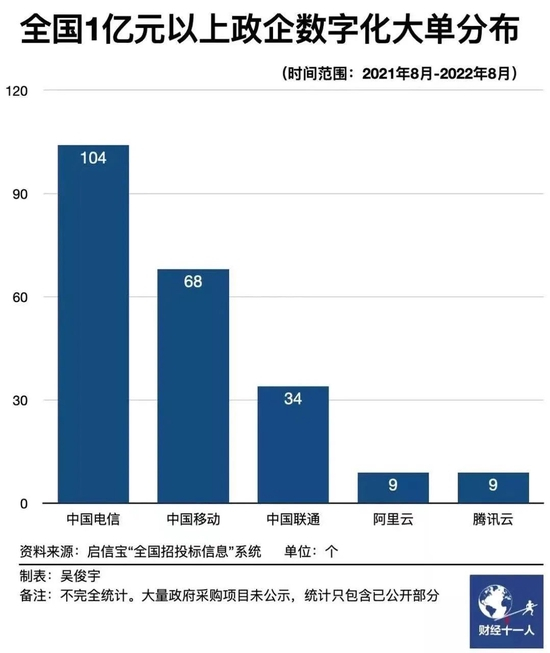 “根正苗红”的新势力浮出水面——三大电信运营商狂奔猛进,2022年上半年的云业务总和,已经是两个阿里云的体量。他们俨然有成为政企市场主力军的雄心——据财经杂志统计,中国电信近1年来获得的政企数字化大单就已有104个,阿里同期只有9个。
