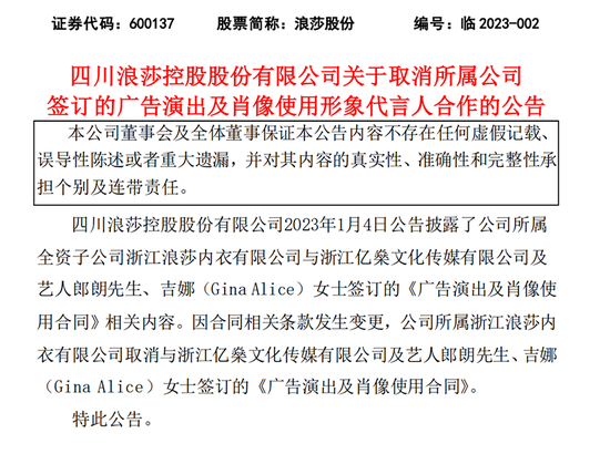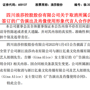 1月4日晚间,浪莎股份发布公告表示,因合同相关条款发生变更,公司全资子公司浙江浪莎内衣有限公司取消与浙江亿燊文化传媒有限公司及艺人郎朗、吉娜(Gina Alice)签订的《广告演出及肖像使用合同》。