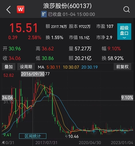2007年5月30日,*ST长控正式变更为“*ST浪莎”,完成借壳上市。这一天,*ST浪莎的股价已将涨至43.71元/股,总市值达31亿元。