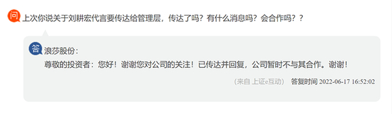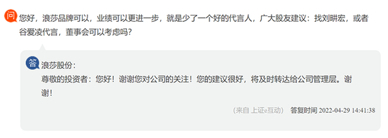 互动平台上,投资者也表示了质疑,有的投资者怀疑浪莎股份有“炒作”之嫌,也有的投资者猜测是不是双方因为代言费没谈拢。