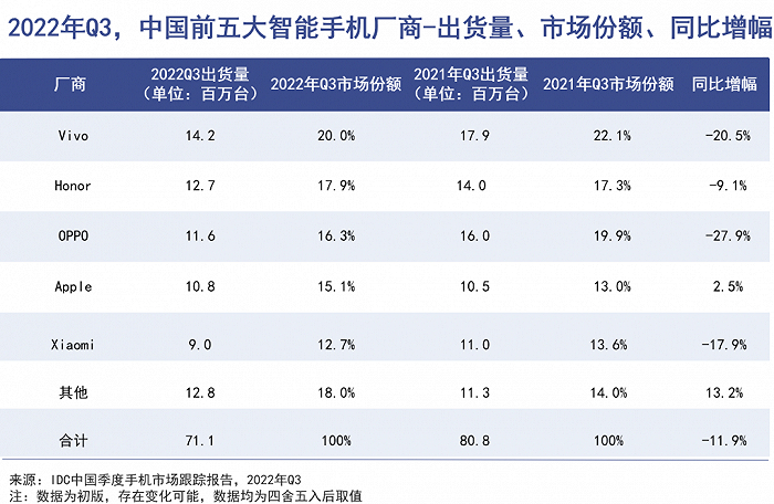 行业蛋糕变小了,而消费者更偏向高端耐用的产品,苹果每代产品价格基本过万,但仍旧可以卖出高溢价,而且卖得更好。2022第三季度,苹果是前五大手机厂商中唯一逆势增长的品牌,在中国手机市场份额提升至15.1%。