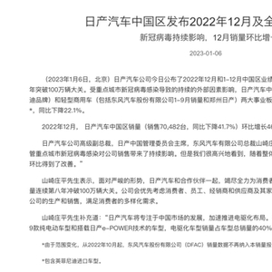 1月6日,日产中国公布2022年度在华销量,连续8年销量突破百万。数据显示,2022年度日产汽车中国区含乘用车(日产、启辰和英菲尼迪品牌)和轻型商用车(东风有限1-9月销量和郑州日产)两大事业板块在内累计销量为104.5万辆,同比下滑22.1%,其中2022年12月日产汽车中国区销量7.05万辆,同比下滑41.7%。