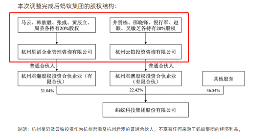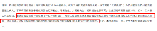 杭州君瀚和杭州君澳的普通合伙人均为杭州云铂,换言之,杭州云铂作为两家合伙企业的合伙事务执行人合计持有蚂蚁集团53.46%(31.04%+22.42%)的股份,持股比例超过了一半。