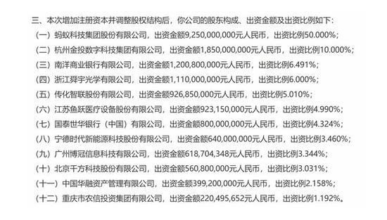 增资扩股后蚂蚁金服的资本金上升至185亿元,股东增加至12位,蚂蚁集团依然持股50%,剩下的11位股东中包括持有10%股份的杭州金投、持股6.491%的南洋商业银行、持股2.158%的中国华融资产、持股1.192%的重庆市农信投资集团。