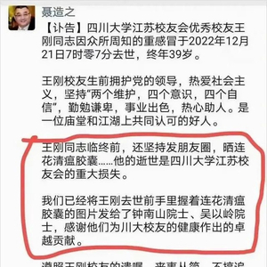 原因是,2022年12月12日,他在微博及朋友圈发布了一则讣告称,王刚同志在临终前还坚持发朋友圈,晒连花清瘟胶囊。他的逝世是四川大学江苏校友会的重大损失。我们已经将王刚去世前手里握着连花清瘟胶囊的图片发给了钟南山院士、吴以岭院士,感谢他们为川大校友的健康作出的卓越贡献。