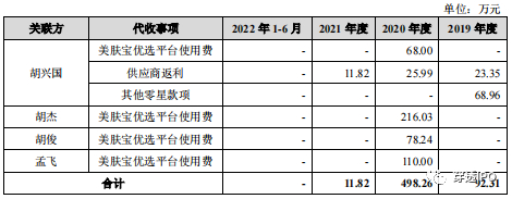 一方面,是关联方资金占用。2019年-2021年,环亚科技通过关联方代收客户货款或供应商返利形成的资金占用金额分别为92.31万元、498.26万元、11.82万元。其中,2020年,环亚科技通过实控人胡兴国及其子胡杰、其女胡俊、以及公司董事孟飞向经销商代收美肤宝优选平台使用费合计达472.27万元。