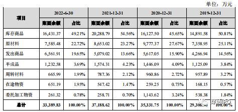 而与高产效率相矛盾的是连年增长的存货量。报告期内,环亚科技存货账面价值分别为2.74亿元、3.28亿元、3.5亿元及3.19亿元,占流动资产的比重分别为29.96%、36.57%、42.75%、及37%。