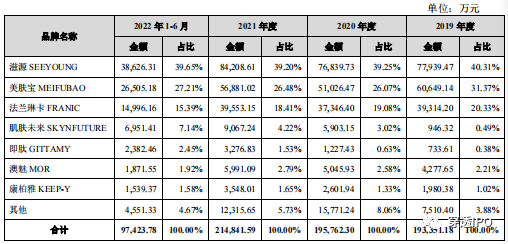 就环亚科技各大品牌业绩表现来看,其前三大主力品牌的营收占比整体呈下降趋势。报告期内,滋源营收占比分别为40.31%、39.25%、39.2%和39.65%;美肤宝营收占比分别为31.37%、26.07%、26.48%和27.21%;法兰琳卡营收占比更是逐年下降,各期分别为20.33%、19.08%、18.41%及15.39%。