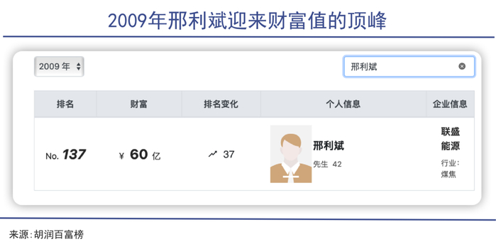 新世纪之初,富豪榜上频频爆出曾经并不知名的山西煤炭大亨,他们快速崛起,又极速陨落。2007年,邢利斌登上胡润富豪榜,两年后身价达到60亿元,公司总资产600亿元的顶峰,而到2014年,邢利斌已经销声匿迹。