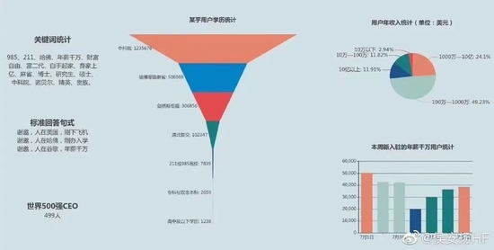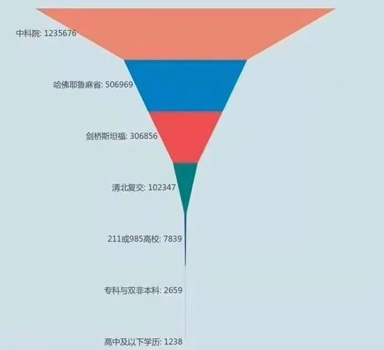 此前网上流传了一张“某乎学历统计图表”,中科院的有1235676位,哈佛耶鲁麻省有506969位。至于985、211,在知乎上更是随处可见。