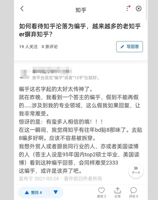 在话题“如何看待知乎沦落为编乎,越来越多的老知乎er摒弃知乎?”话题下,有用户表示,编乎这名字起得太传神了,他曾看到一个答主的编乎,假到不能再假,但有许多人相信。