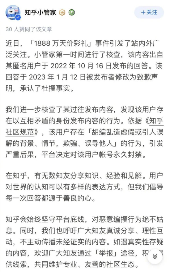 1月13日午间,知乎方面发布公告称,决定对“1888万天价彩礼帖文”发布者账号永久封禁。