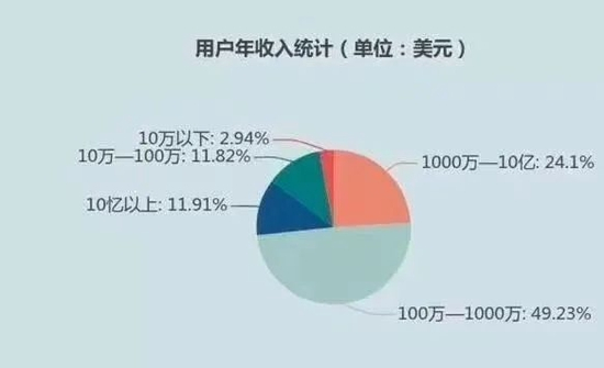 年收入100万—1000万美元的用户最多,有49.23%;年收入1000万—10亿美元的,也有24.1%;人数和金额都最少的,也年入10万美元,占2.94%。