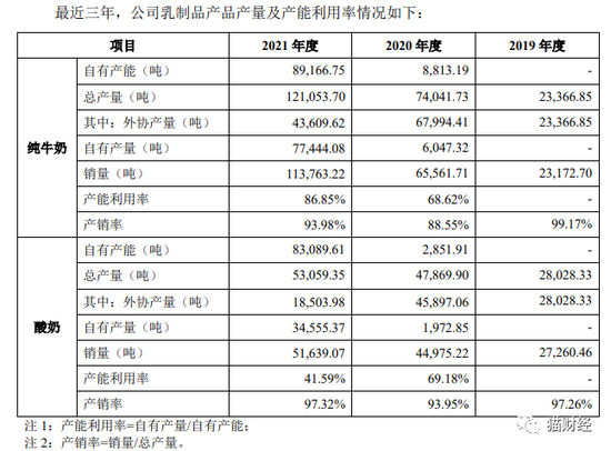 根据招股书,2019年,认养一头牛纯牛奶总产量23366吨,全部为外协产量。直到2020年山东工厂投产后,自主生产才逐渐成为公司的主要生产模式,不过2020年公司纯牛奶总产量74041吨,其中自有产量仅为6047吨,尚不足十分之一。甚至到了2021年,认养一头牛纯牛奶总量中有近四成来自外协。