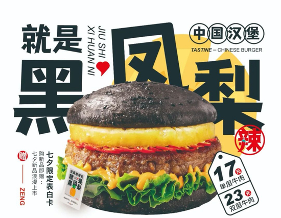 去年七夕,塔斯汀推出了一款墨鱼汁堡胚加炭烤菠萝的黑凤梨(粤语谐音“喜欢你”)汉堡。线上结合嗅、触、视、味、听五感,分别与江小白、盼盼等品牌联名跨界做大声势;线下就在门店内配备供恋爱脑们冲动表白的“应急玫瑰”,凭实力成为“节日抢钱大作战”中的社交爆款。