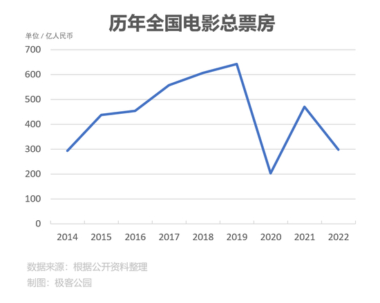 疫情对电影行业的冲击在票房上体现得最明显,2019 年全国票房是 641 亿,2020 年最低谷是 203 亿,2022 年相当于只有 2019 年的 45% 不到,大盘的数据是这样,影院的收入也是相对应的下降。
