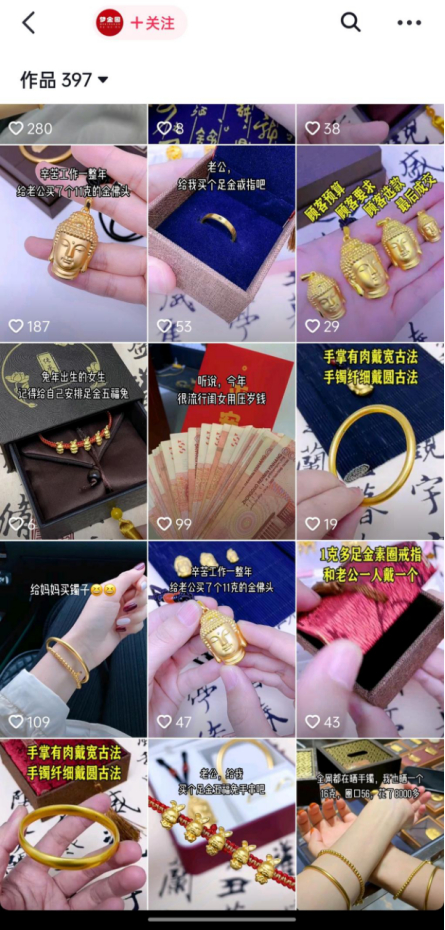 新浪财经发现,在梦金园官方旗舰店的社交媒体账号上,也是充斥着类似编故事营销的视频内容。“听说,今年很流行闺女用压岁钱给妈妈买镯子。”“邻居以为我2万多买的,其实才花了8000多。”“老公,给我买个1克多的足金戒指吧,不是我买不起,是你买的比较好看。”